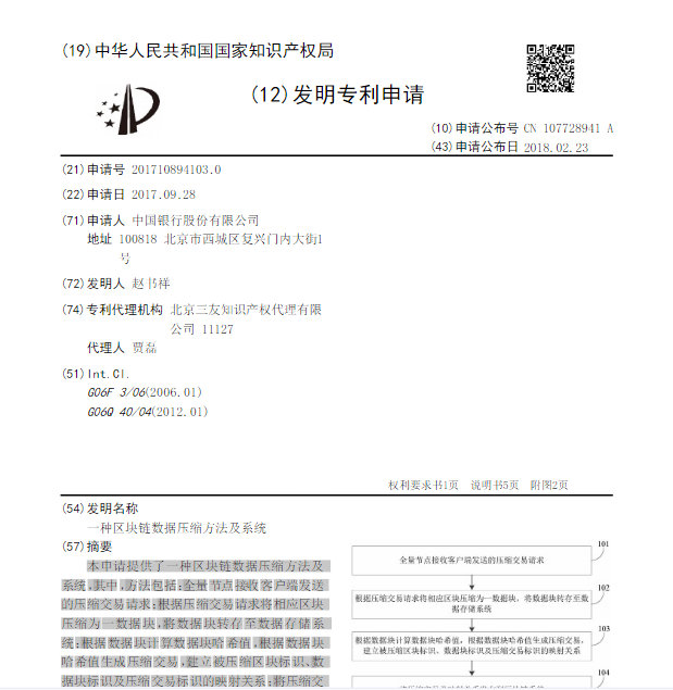 ,其间就包含四大国有商业银行之一的我国银行。2月24日音讯,依据国家知识产权局(SIPO)本周五(2月23日)发布的文件显现,我国银行在2017年9月28日初次提交了一项关于区块链扩容的专利。