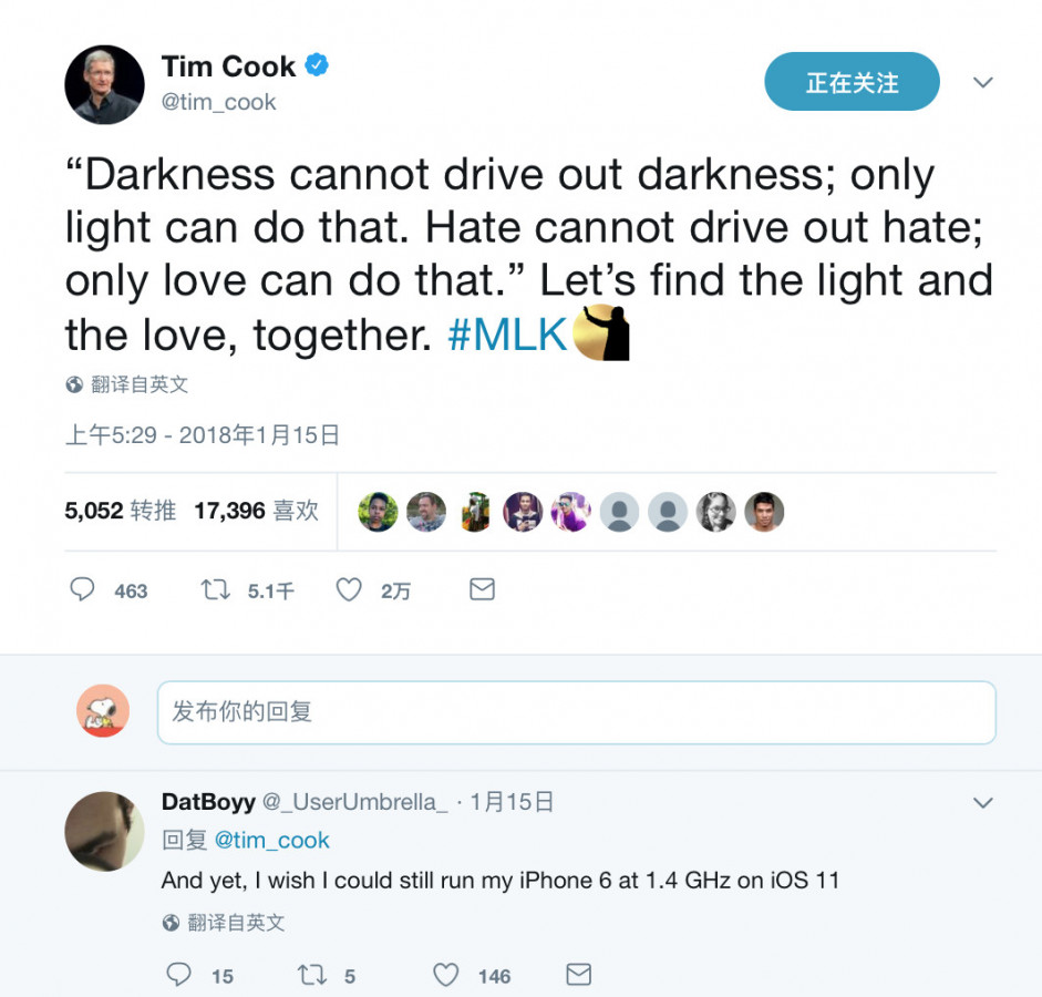 困扰。1月15日是马丁·路德·金的留念日,苹果 CEO 库克发了一条推特,引证其名言来留念这位民权运动首领。可是,网友如同不太关怀,得到最多“喜爱”的回复翻译成中文后却是“是的,可是我期望我的iPhone 6还能以1.4GHz频率运转 iOS 11。”